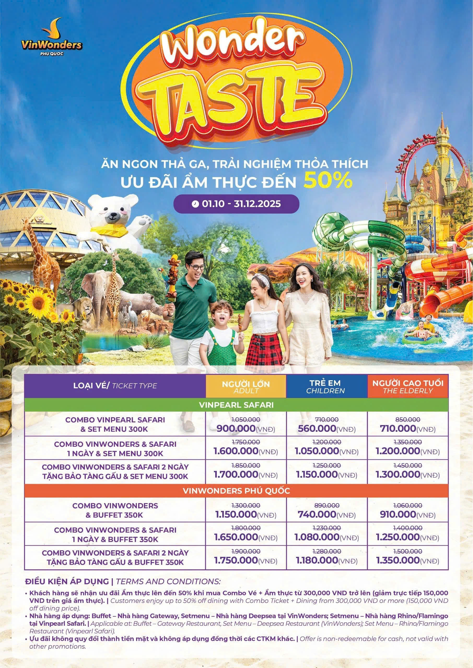 VND trên giá ẩm thực). | Customers enjoy up to 50% off dining with Combo Ticket + Dining from 300,000 VND or more (150,000 VND - Nhà hàng áp dụng: Buffet – Nhà hàng Gateway, Setmenu – Nhà hàng Deepsea tại VinWonders; Setmenu – Nhà hàng Rhino/Flamingo tại Vinpearl Safari. | Applicable at: Buffet – Cateway Restaurant, Set Menu – Deepsea Restaurant (VinWonders); Set Menu – Rhino/Flamingo Restaurant (Vinpearl Safari).